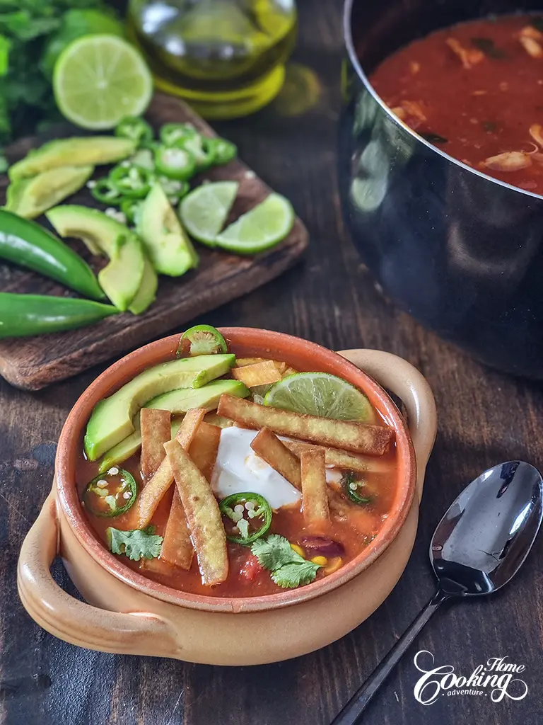 - Serve soup into bowls and top with tortilla strips, sour cream, jalapeno slices, lime wedges, and sliced avocado. Enjoy!