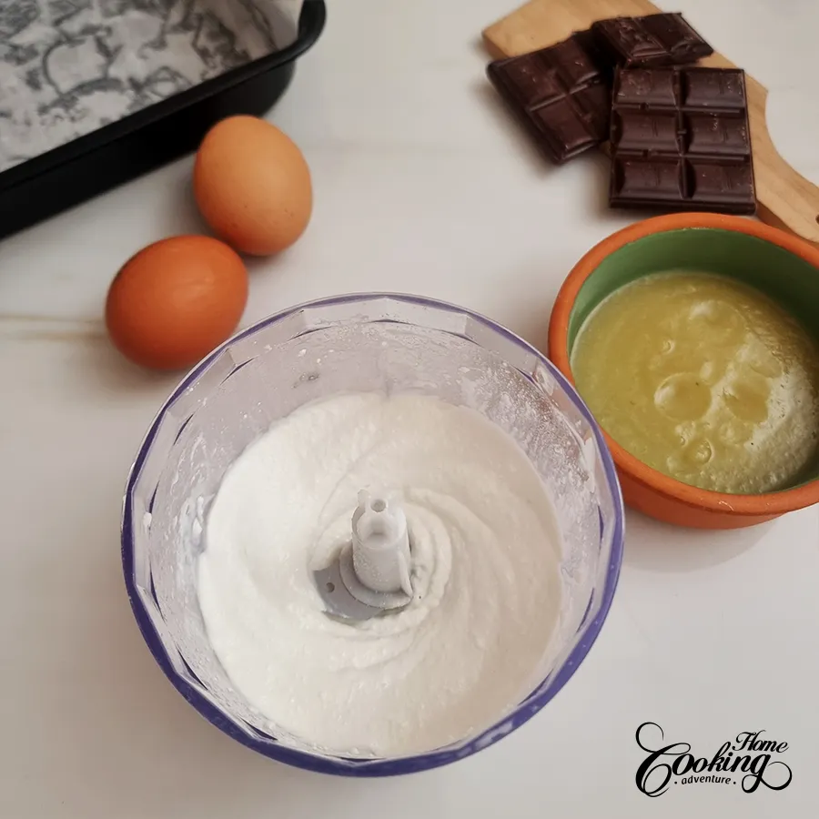 In a blender or food processor, blend the cottage cheese, applesauce, honey, eggs, salt, instant coffee powder and vanilla extract until completely smooth and creamy.
