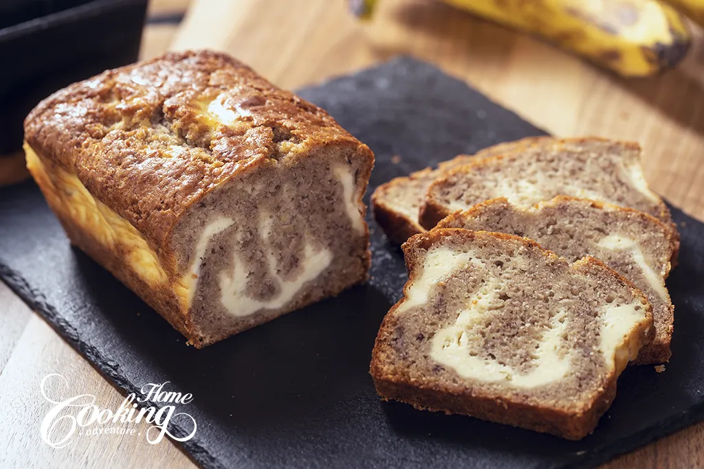 Una vez que la masa de plátano esté preparada, mezcla rápidamente los ingredientes del relleno de queso crema. Vierte aproximadamente dos tercios de la masa de plátano en un molde para pan forrado con papel pergamino. Agrega el relleno de queso crema y cubre con el resto de la masa de plátano. Remolina con un cuchillo.