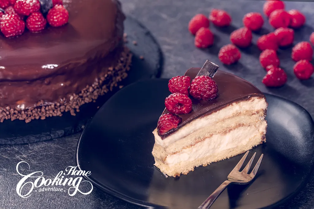 Cubre el pastel con glaseado de chocolate y decora antes de servir con frambuesas frescas.