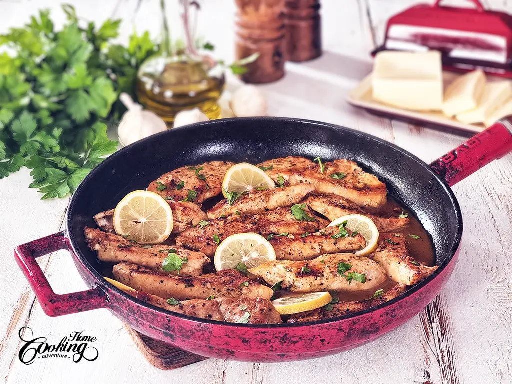 Pechugas de pollo tiernas son la estrella de este plato. Cada pieza se dora a la perfección en una sartén caliente, sellando esos jugosos y suculentos sabores. Luego viene el ingrediente mágico: una salsa de mantequilla con ajo. Caldo de pollo, mantequilla y dientes de ajo recién picados se cocinan en el jugo residual del pollo, impregnando la cocina con un aroma irresistible. Los trozos de pollo se devuelven a la sartén mientras la salsa cubre cada pieza. El resultado es una gran mezcla de sabores, el ajo añade un toque sutil mientras que la mantequilla aporta un acabado suave y aterciopelado.
