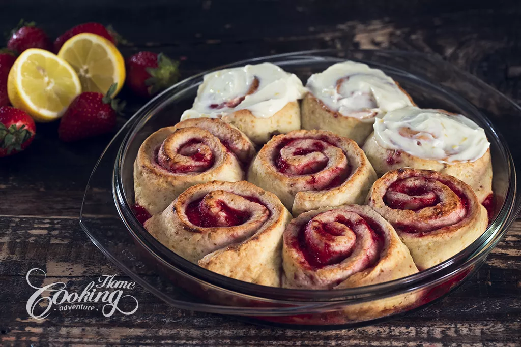 - Extiende el glaseado de queso crema con limón sobre los rollos de fresa calientes. ¡Disfruta!