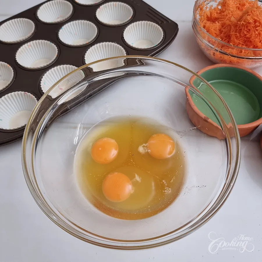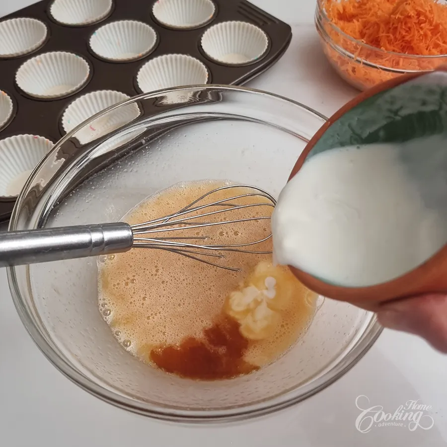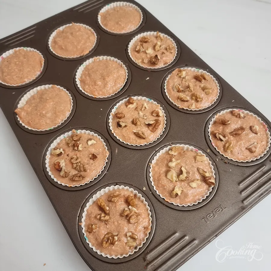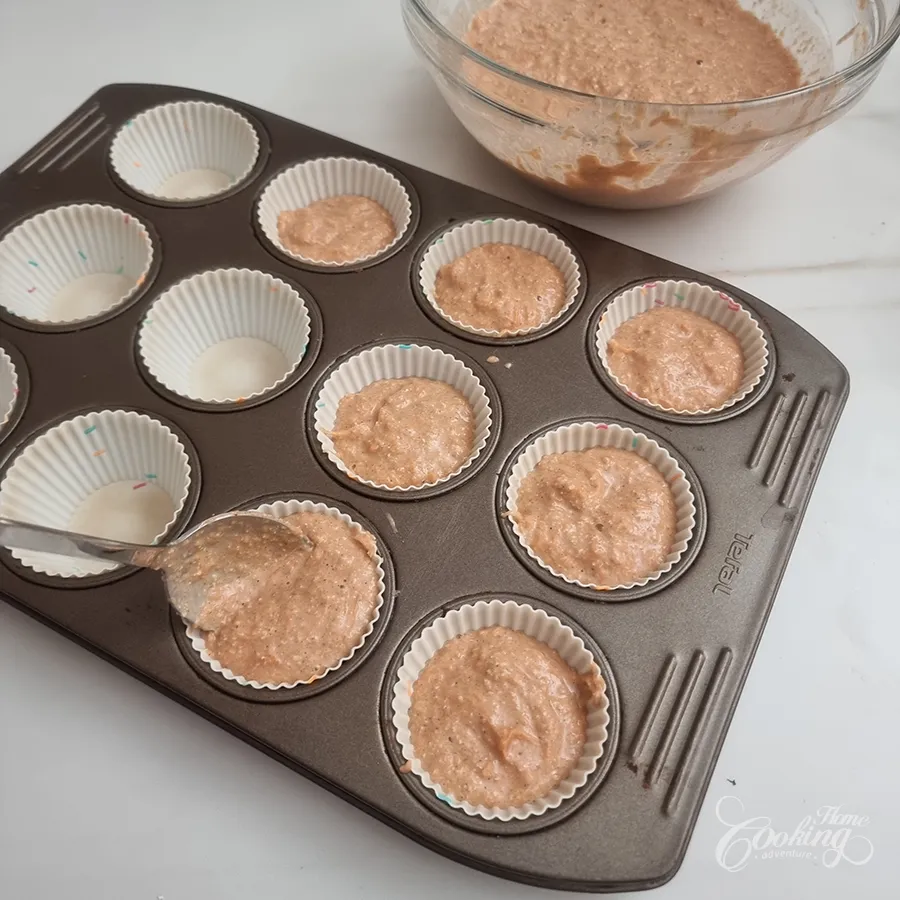Precalienta el horno a 370°F (190°C). Forra un molde para muffins de 12 cavidades con cápsulas de papel o moldes de silicona.