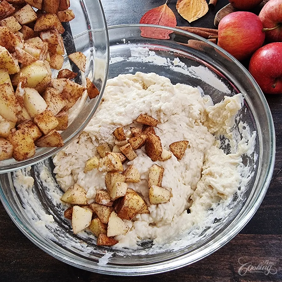 Usando una espátula, incorpora suavemente las manzanas en la masa.