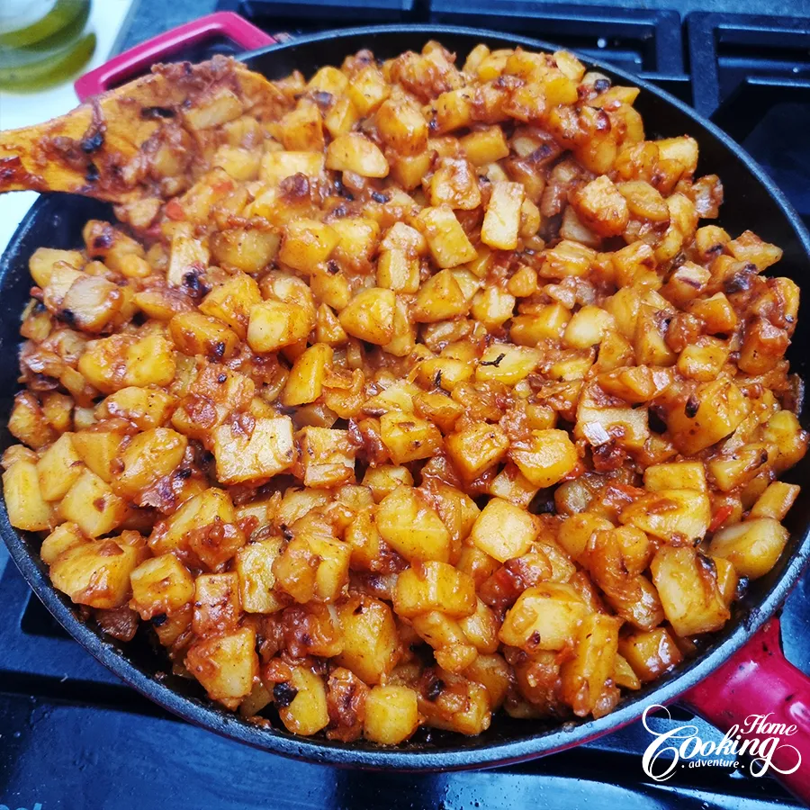 Añade las patatas en rodajas a la sartén. Mezcla suavemente todo para que queden cubiertas con el aceite de pimentón. Sazona con sal.