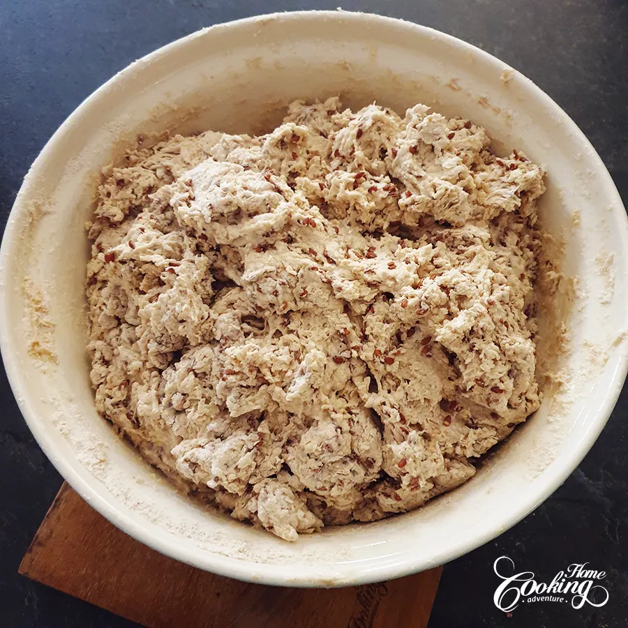 Le matin, préparez la pâte finale. Mélangez le levain de la veille avec l’eau et le trempage de graines de lin dans un grand bol. Ajoutez ensuite la farine à pain et la farine de seigle. Laissez reposer 30 minutes.