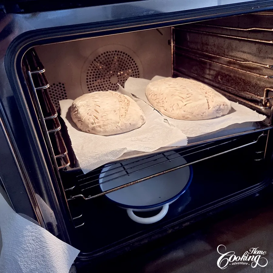 Baissez la température à 440°F (230°C) et faites cuire encore 15-20 minutes sans vapeur jusqu’à ce que le pain soit doré et croustillant à l’extérieur.
