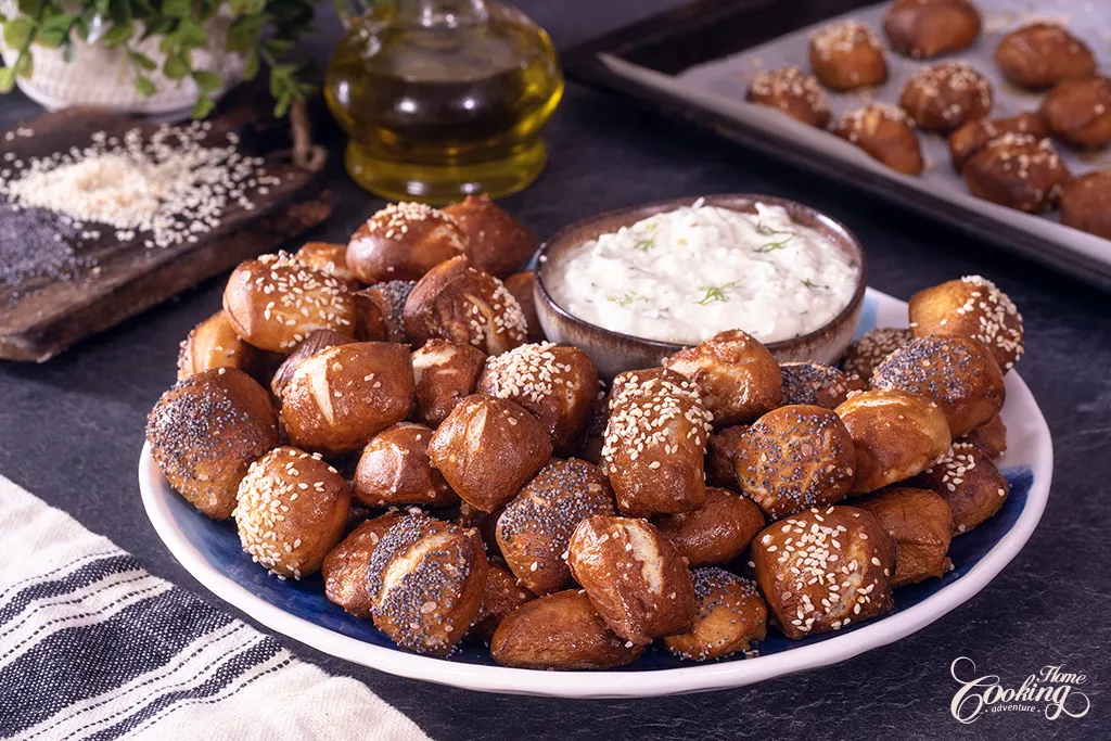- Servez la sauce aux herbes au yaourt grec et au fromage avec des bouchées de bretzel moelleuses et chaudes. Bon appétit !