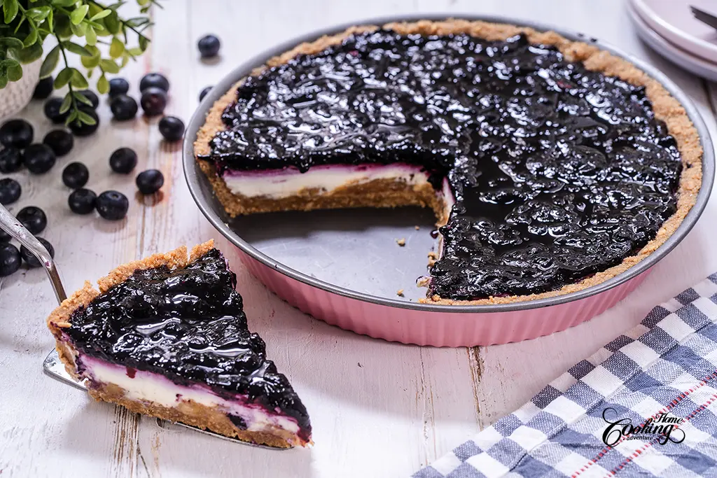 Cette tarte à la ricotta banane et myrtille est un dessert sans cuisson parfait pour l’été. La préparer est super facile et elle regorge de saveurs gourmandes. Elle se compose d’une croûte de biscuits beurrée garnie d’une couche sucrée de bananes caramélisées, d’une garniture crémeuse à la ricotta et d’une sauce aux myrtilles fraîches sur le dessus.