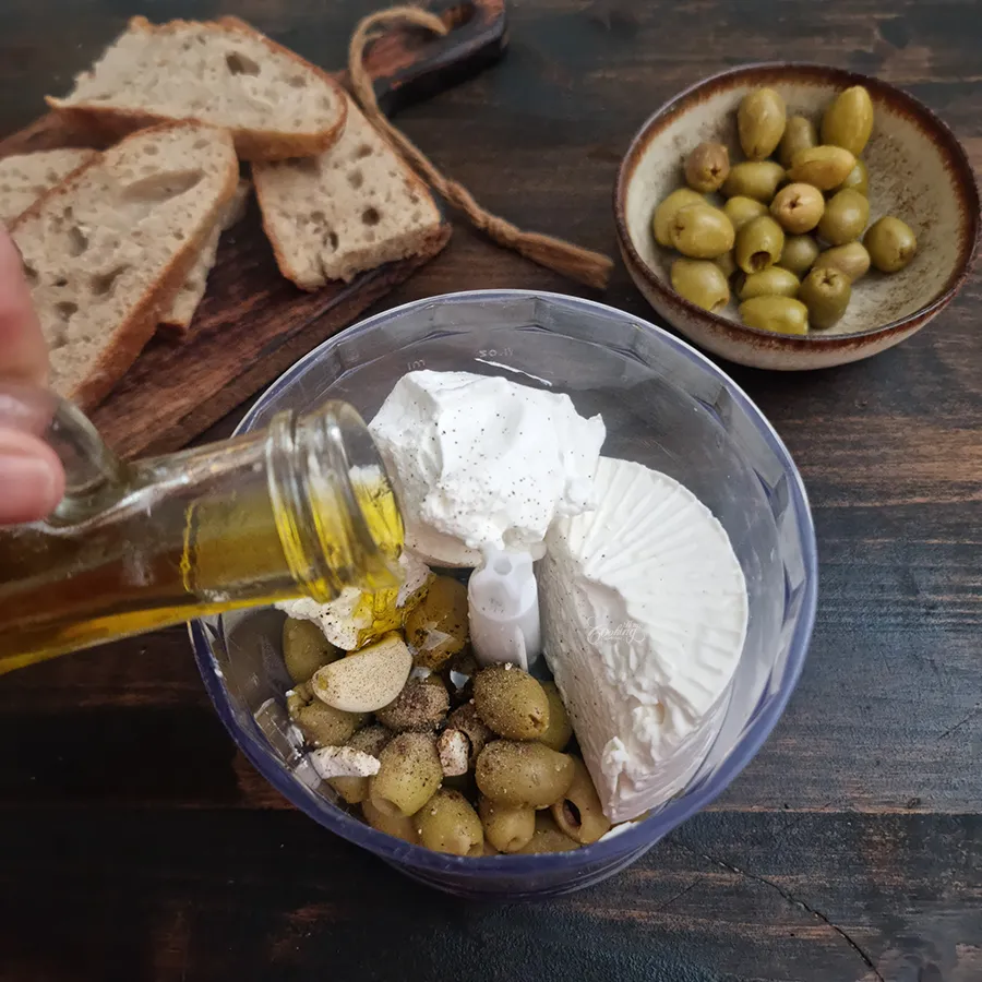 Dans un robot culinaire, ajoutez la feta, les olives vertes, le yaourt grec, l’ail, le jus de citron et du poivre noir fraîchement moulu.
