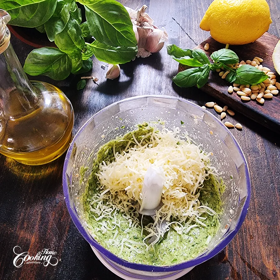 This Homemade Pesto is a fresh and flavorful sauce made from simple ingredients. Originating from Italy, it combines fresh basil leaves, pine nuts, Parmesan cheese, garlic, and olive oil.