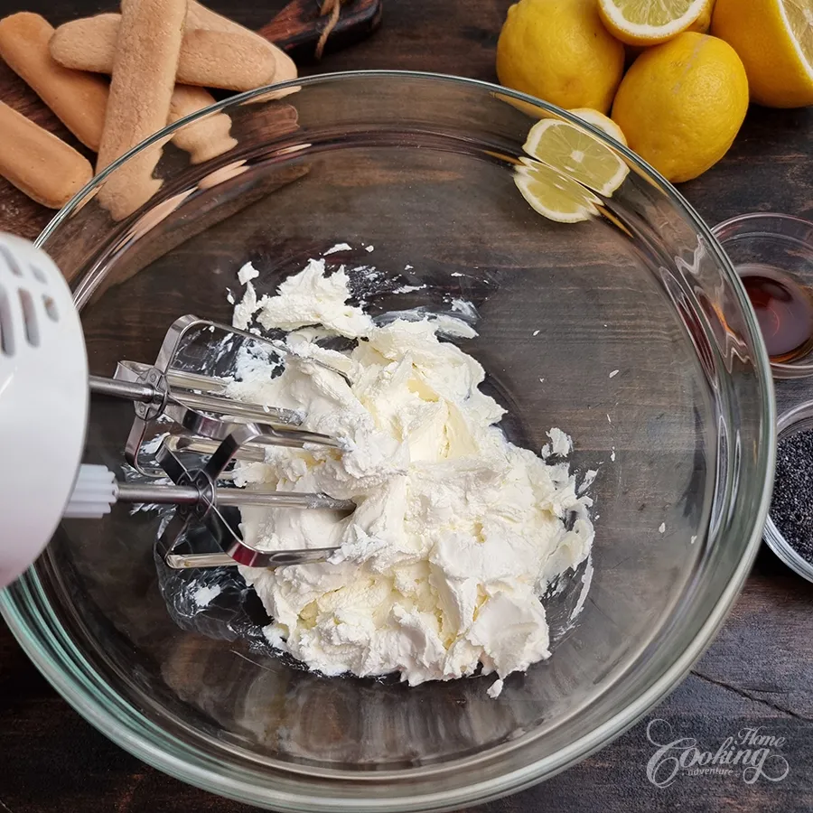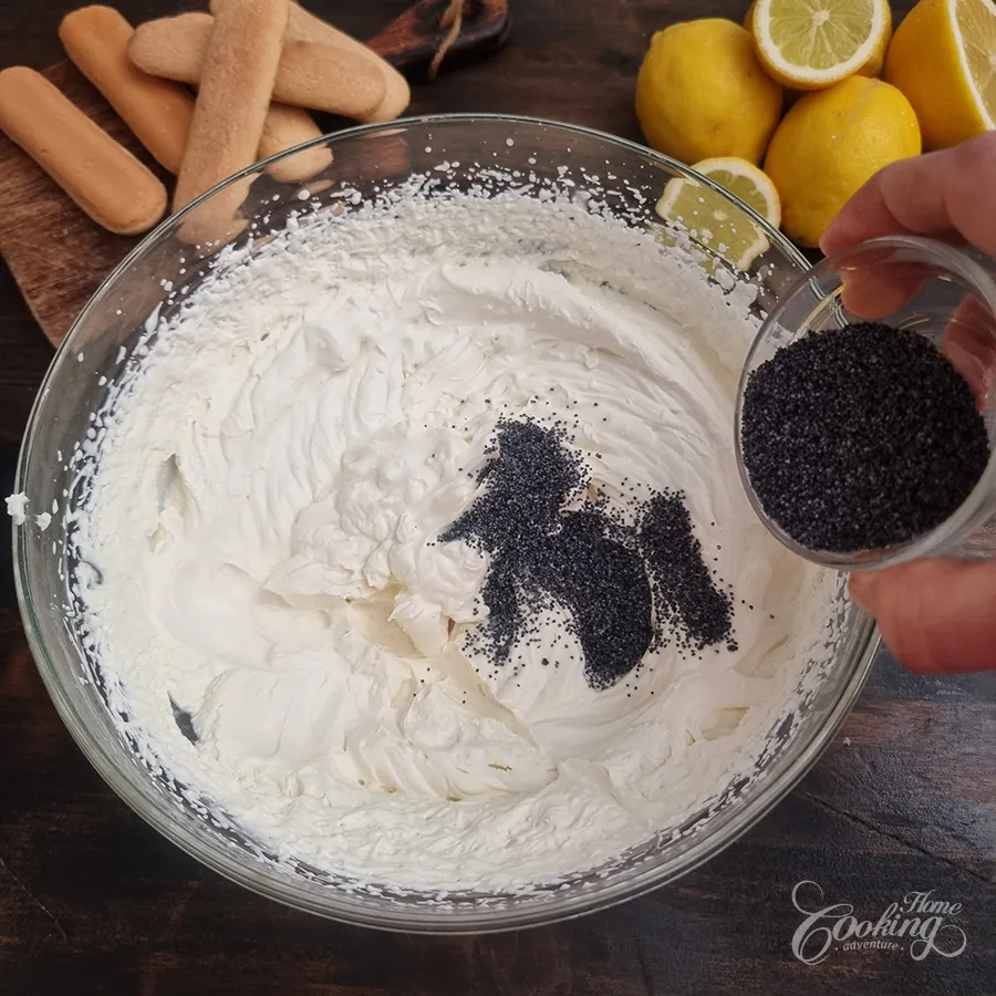 Pour in the whipping cream and continue mixing until stiff peaks form and the filling becomes light and airy. Gently fold in the poppy seeds, then set aside.