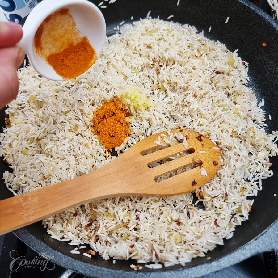Măriți ușor focul la mediu–mare. Amestecați orezul doar în centru timp de 2–3 minute, până devine ușor auriu.
