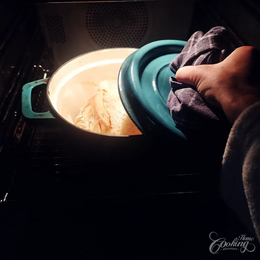 Preîncălziți cuptorul la 470°F (240°C) cu fie o piatră de copt, fie un cuptor olandez de 9 inci (23cm) în interior. În cazul în care nu aveți niciuna, folosiți pur și simplu o tavă de copt și preîncălziți cel puțin 30 de minute înainte de coacere (Dacă folosiți piatra de copt sau tava de copt, puneți un vas mic cu apă la baza cuptorului pentru a crea abur; cuptorul olandez nu are nevoie, deoarece capacul va crea suficient abur.)