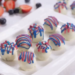 Drizzle the red and blue chocolate over the top of the truffles, making designs of your choice.