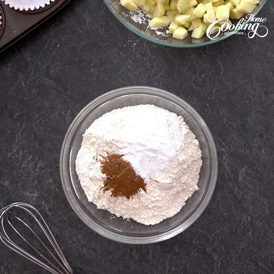 In a medium bowl whisk together flour with baking powder, cinnamon and salt.