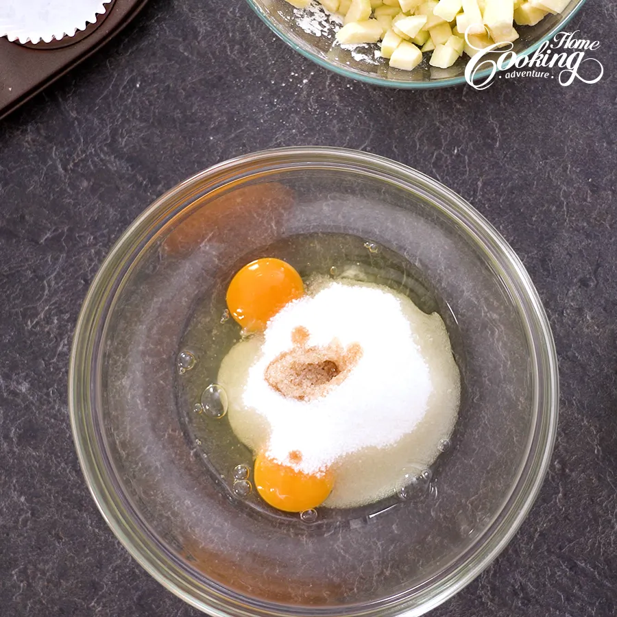 Add eggs with sugar and vanilla extract in a large bowl and mix to combine.