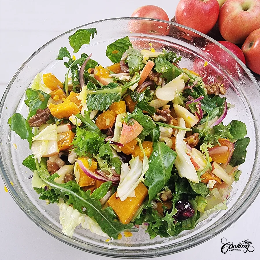 In a large bowl, combine sliced apples, pumpkin cubes, toasted nuts, dried cranberries, red onion, feta and greens.