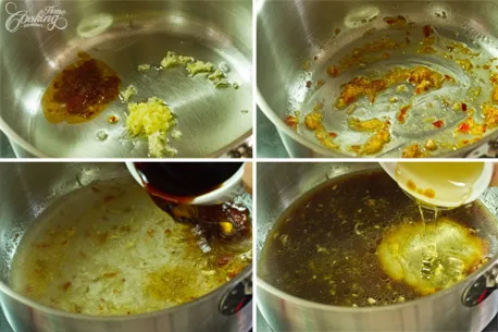 In a saucepan over medium heat add the sesame oil, garlic, ginger, chili jam and stir for a few seconds. Add the water (chicken stock), soy sauce, honey, vinegar and brown sugar. Stir until it comes to a boil.