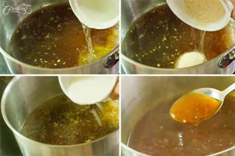 Whisk together the cornstarch and 2 tbsp of water and once the mixture is boiling add the cornstarch mixture, stirring until it thickens. Keep it on very low heat until the chicken is cooked.