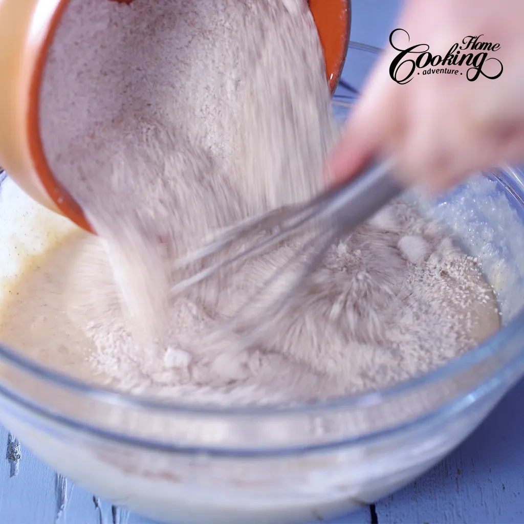 Add the salt, cinnamon, baking powder, baking soda and the oat flour. Mix to combine. Let the batter stand for 5 minutes.