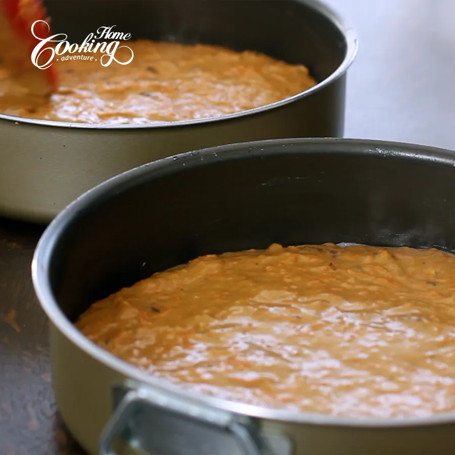Pour the batter evenly into the prepared pans.