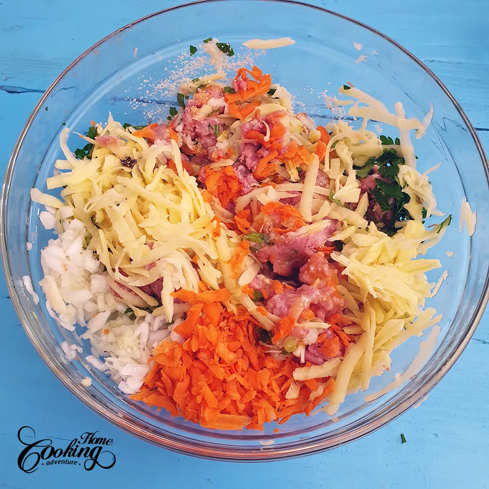 Add all the rest of ingredients: onion, garlic, green onion, breadcrumbs, eggs, grated potato and carrot, fresh parsley, salt and pepper.
