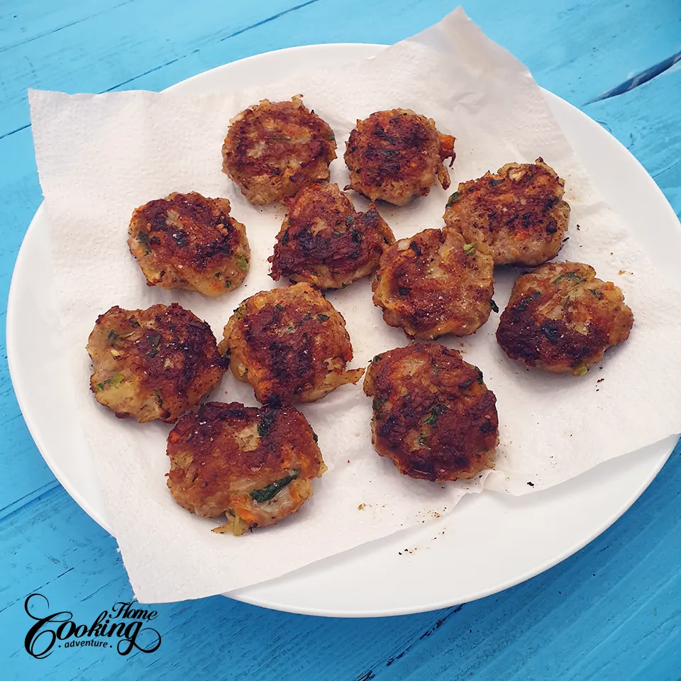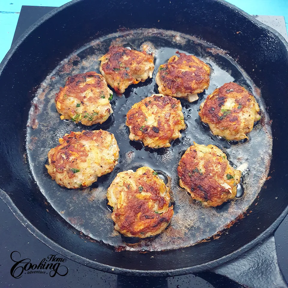Take spoonfuls of chicken mixture, flatten slightly, and transfer to the hot skillet.