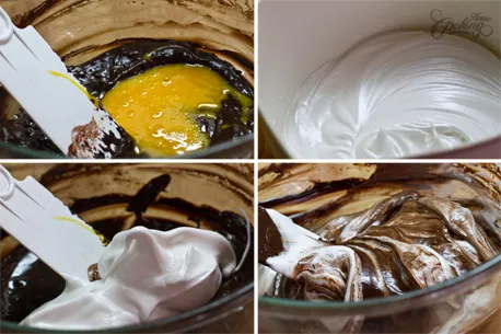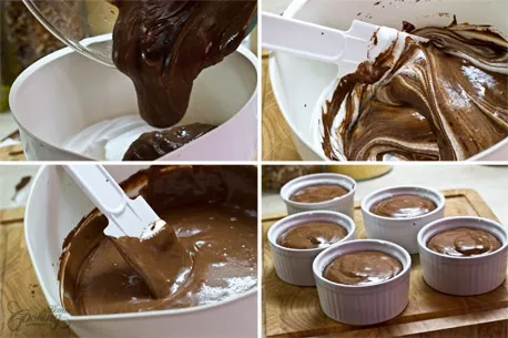 Using a rubber spatula gently mix one-third of the egg whites into the chocolate mixture. Then fold the chocolate mixture into the remaining whites. Spoon batter into prepared molds.