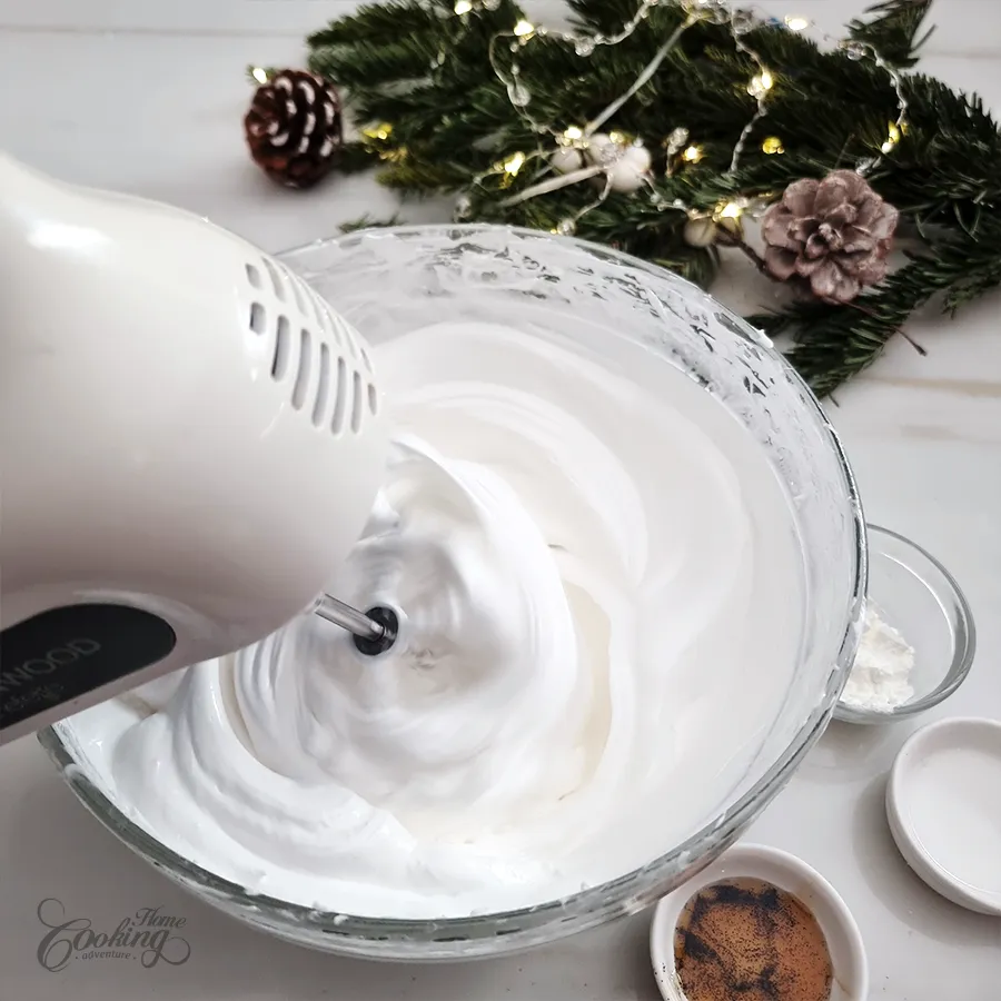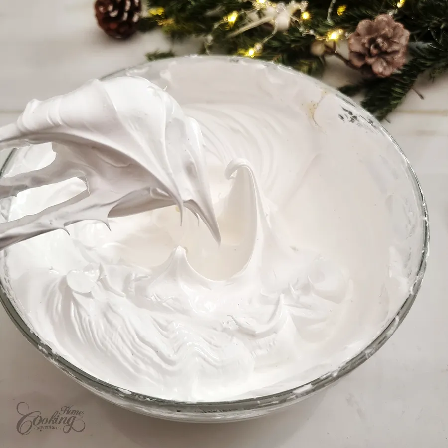 Continue beating for 5–7 minutes, until the meringue is very stiff and glossy and is holding sharp peaks.