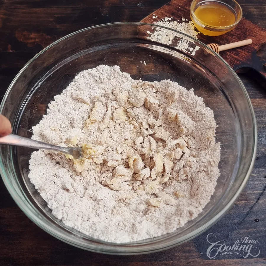 Use a fork or pastry cutter to incorporate them until the mixture resembles fine breadcrumbs.