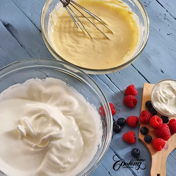 Gradually incorporate the whipped whites into the egg yolk mixture.