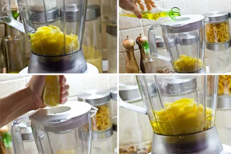 Place the lemon peels in the bowl of the blender. Add olive oil, lemon juice, salt, sugar and water.
