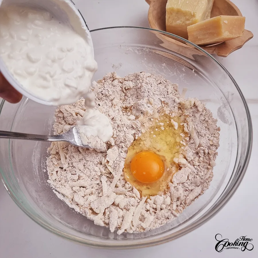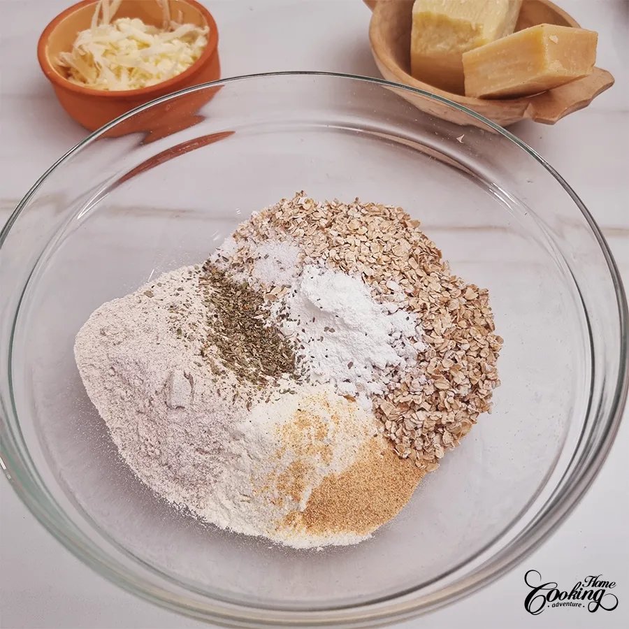 In a medium bowl, whisk together flour, oats, whole wheat flour, salt, baking powder, dried oregano and garlic powder.