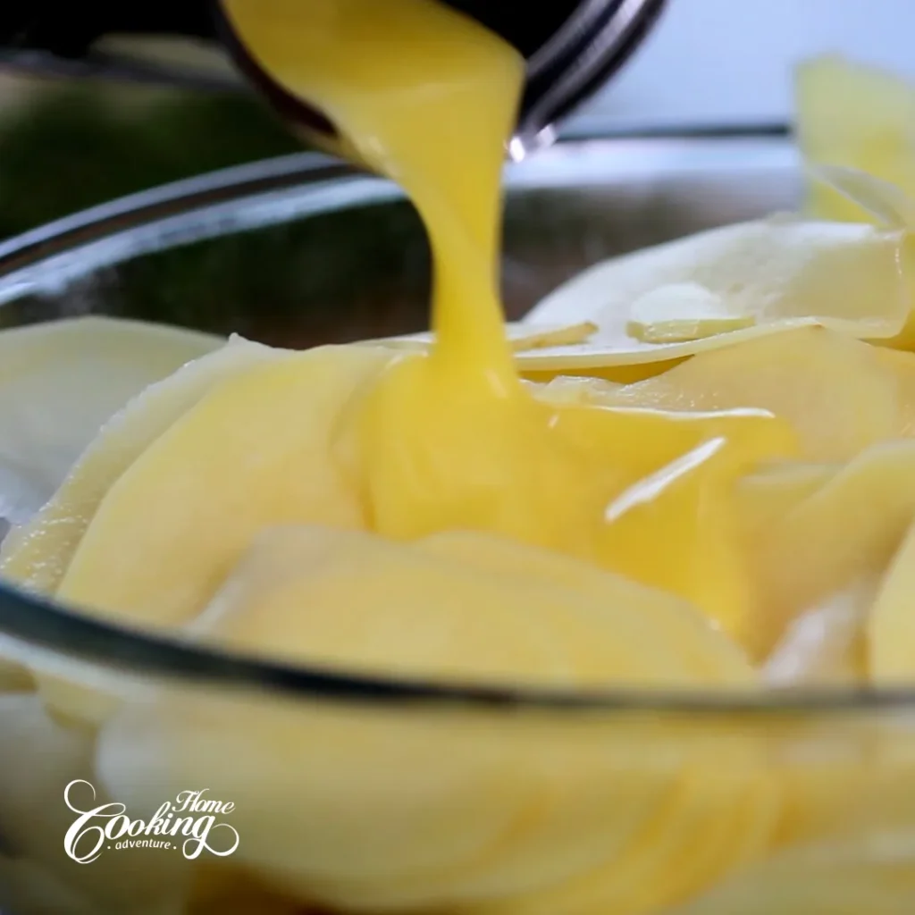 Place the potato slices into a large bowl. Add melted butter.