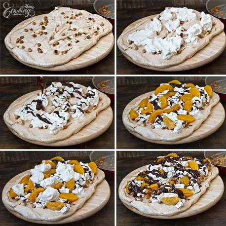 Start assembling the meringue: Place the Meringue on your serving plate and sprinkle half of the toasted hazelnuts on top of it. Spoon half of the whipped cream over and then drizzle with some chocolate sauce. Place the peach slices over the top. Add the rest of the whipped cream and chocolate sauce. In the end sprinkle another round of hazelnuts and orange zest.