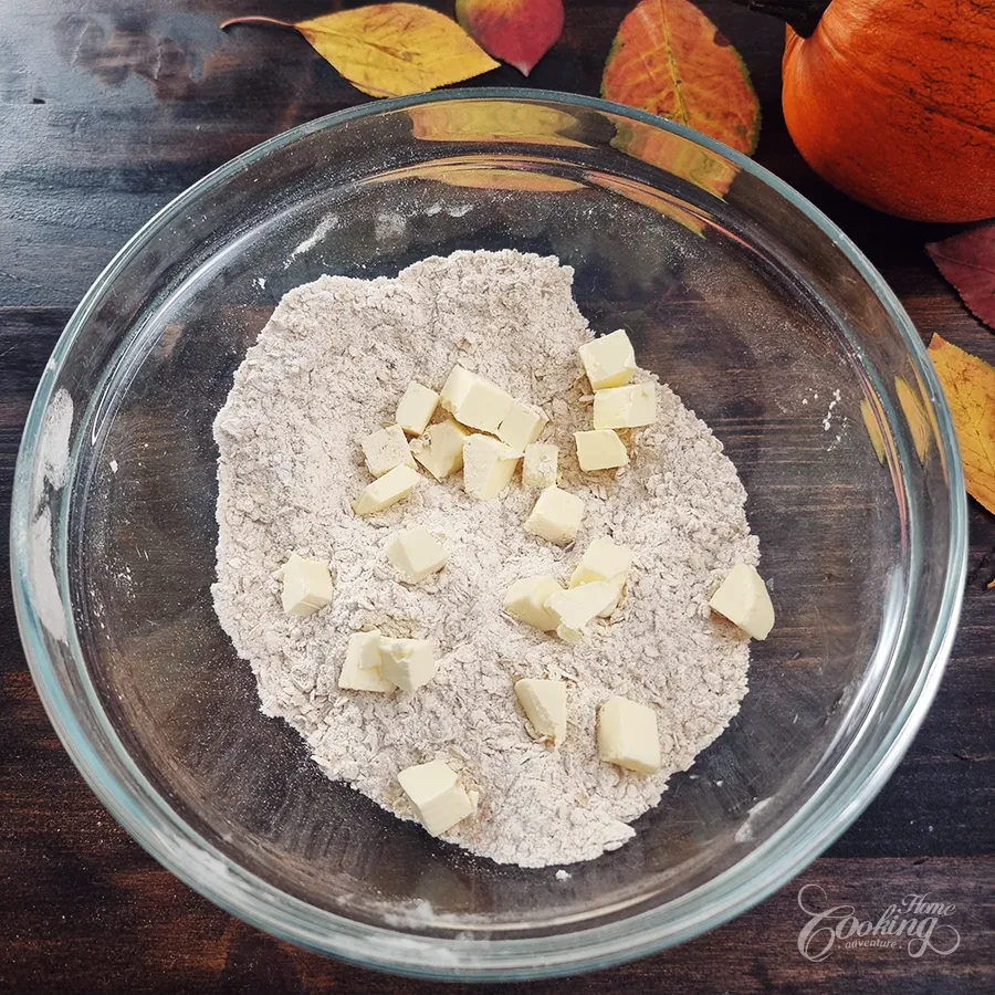 Use a pastry cutter or fork, cut the butter until the pieces are no bigger than peas.