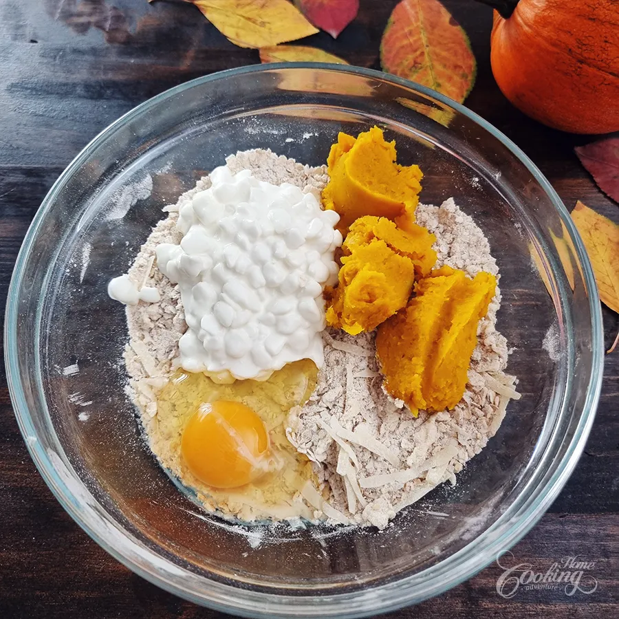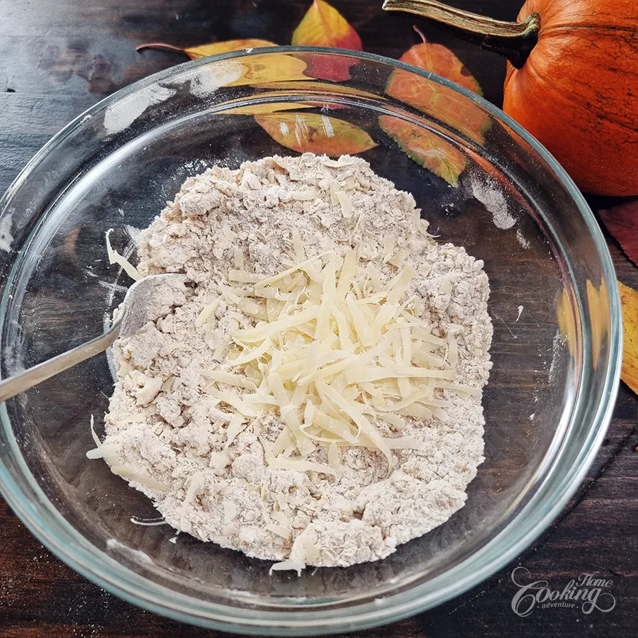 In a large bowl, mix together the flours, rolled oats, baking powder, salt, garlic powder, cinnamon and nutmeg.