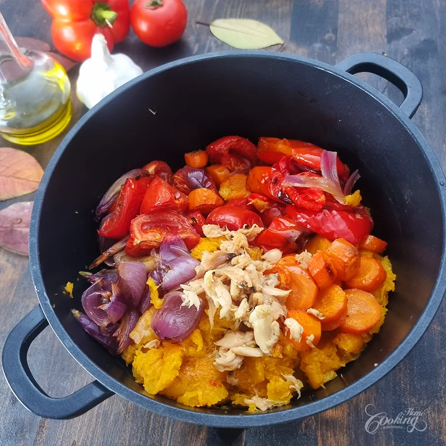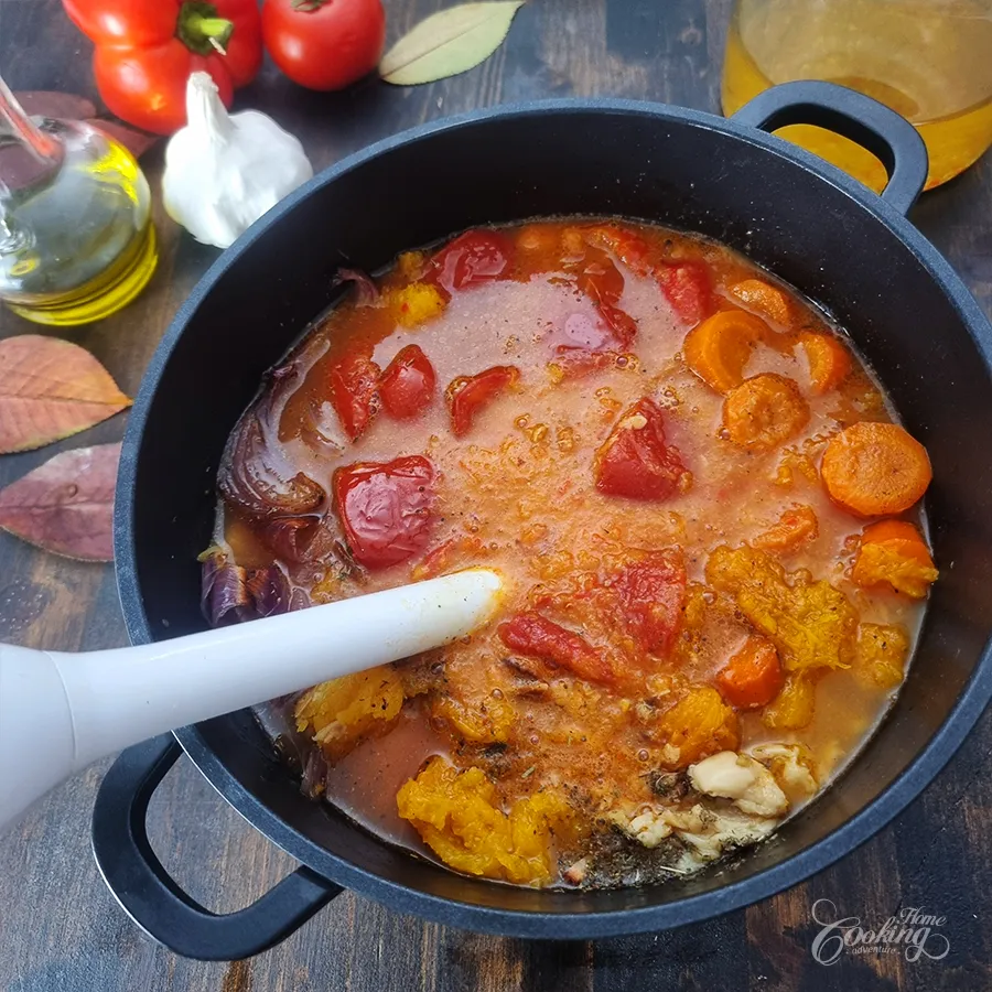 Add all roasted vegetables to a large pot or blender, with smoked paprika and dry thyme.