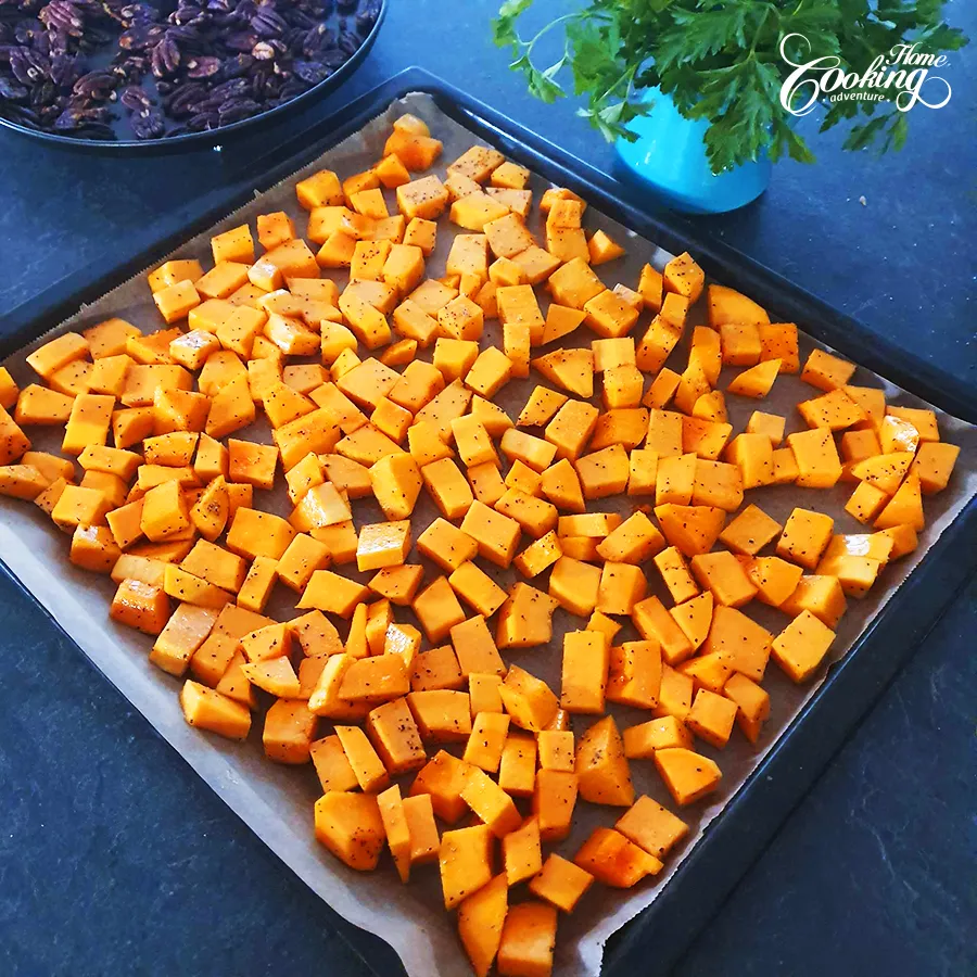 Spread the seasoned squash cubes onto the prepared baking sheet in a single layer.