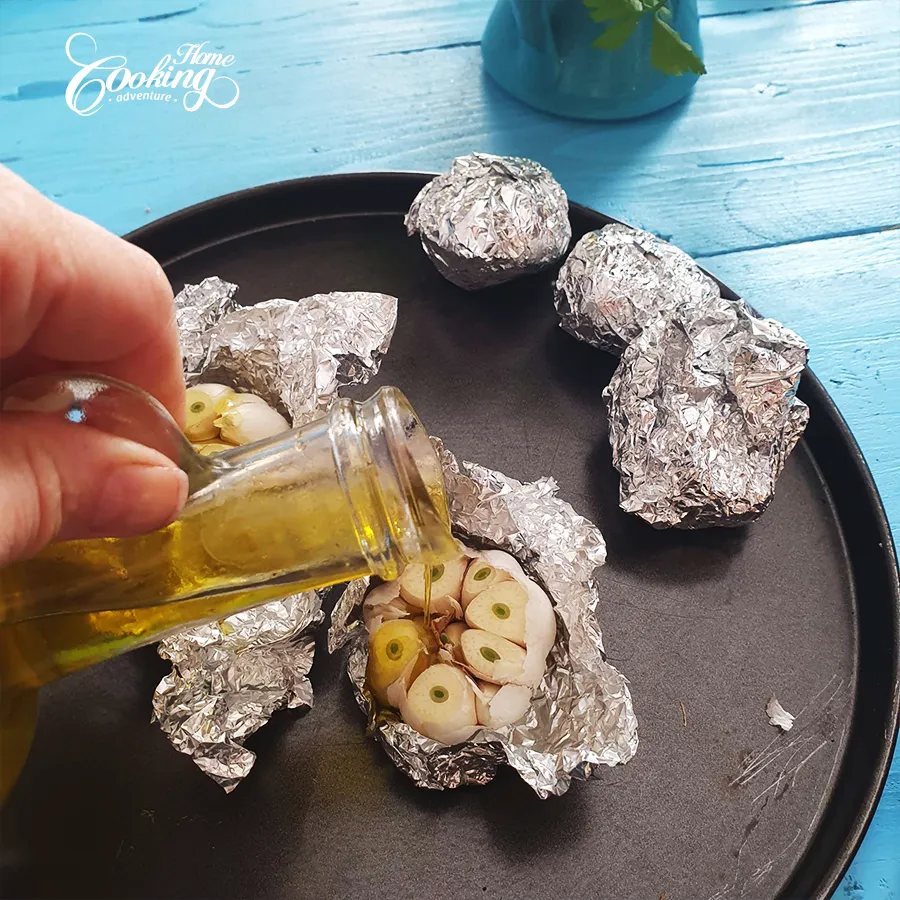 Meanwhile, remove the heads of garlic from the oven. Let them cool slightly.