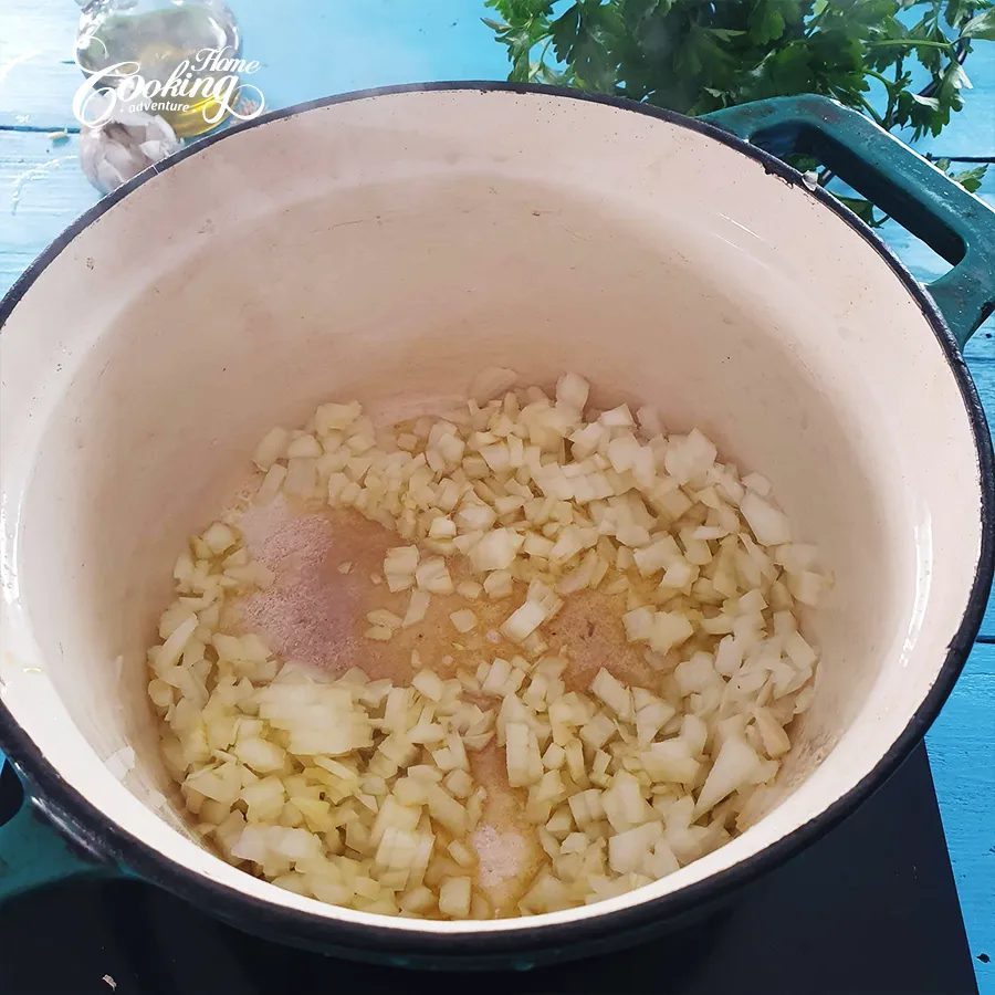 Heat the olive oil in a medium-sized soup pot over medium-high heat. Add the onion and saute for about 5 minutes.