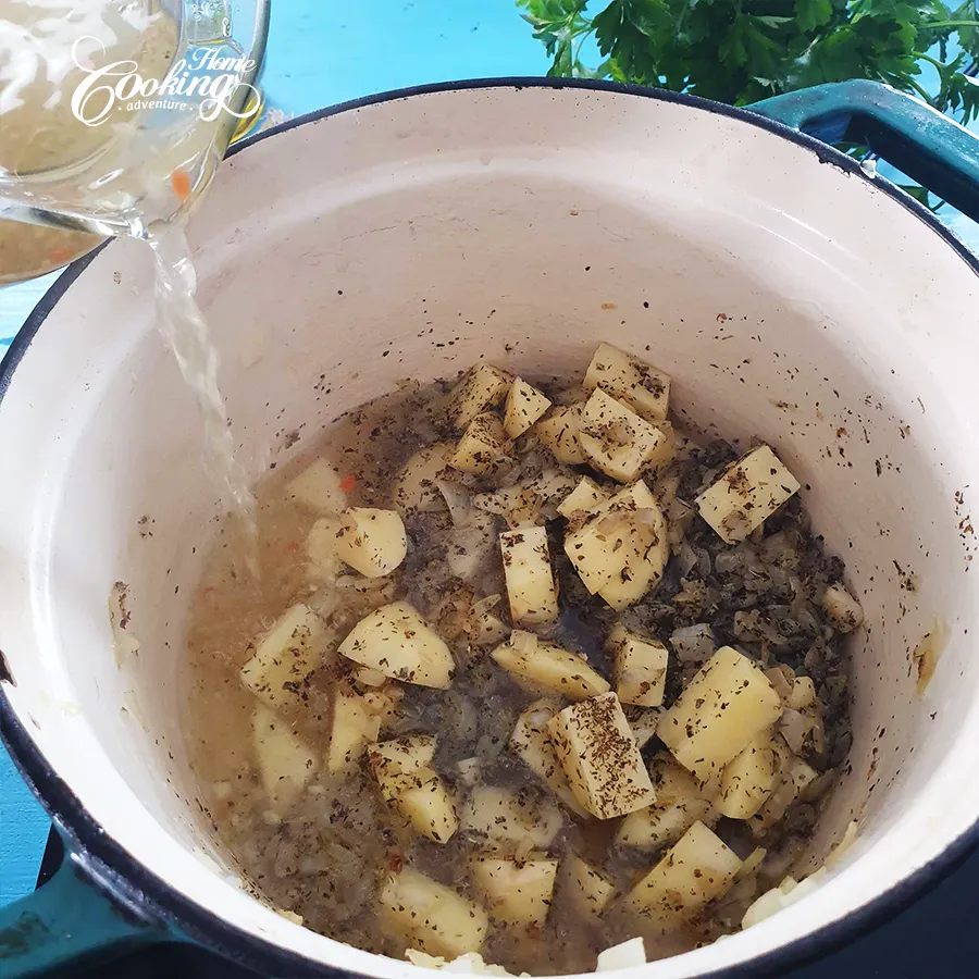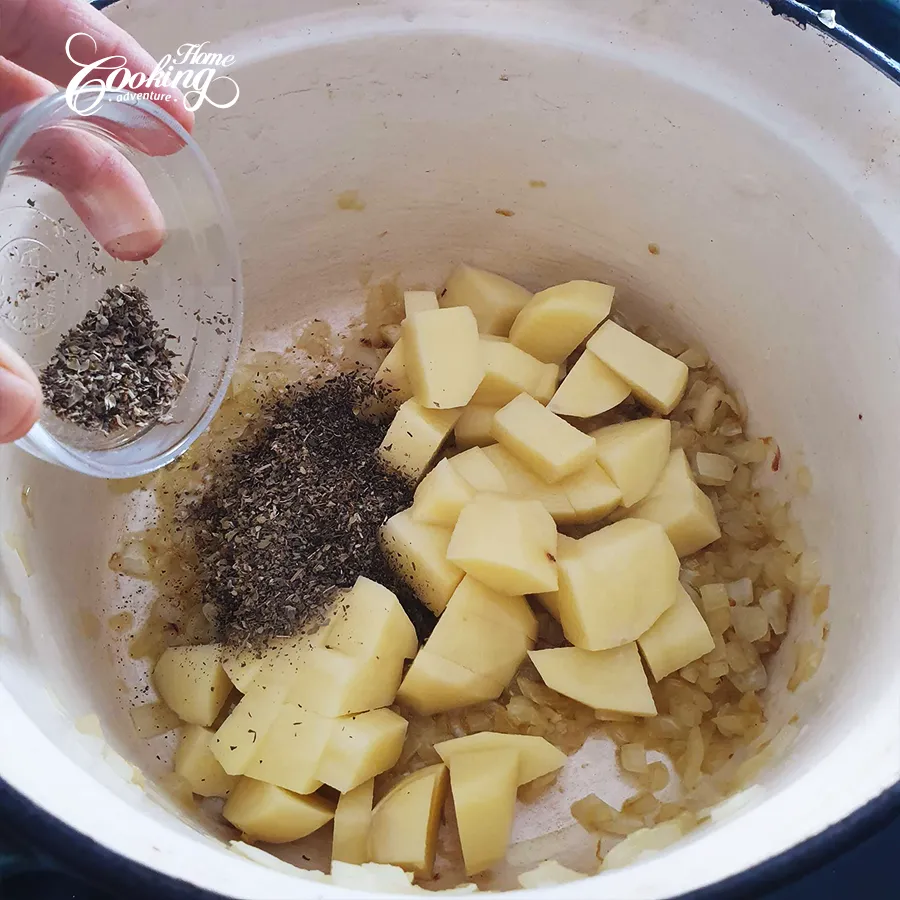 Add the potatoes, basil, thyme and oregano and give a quick stir.