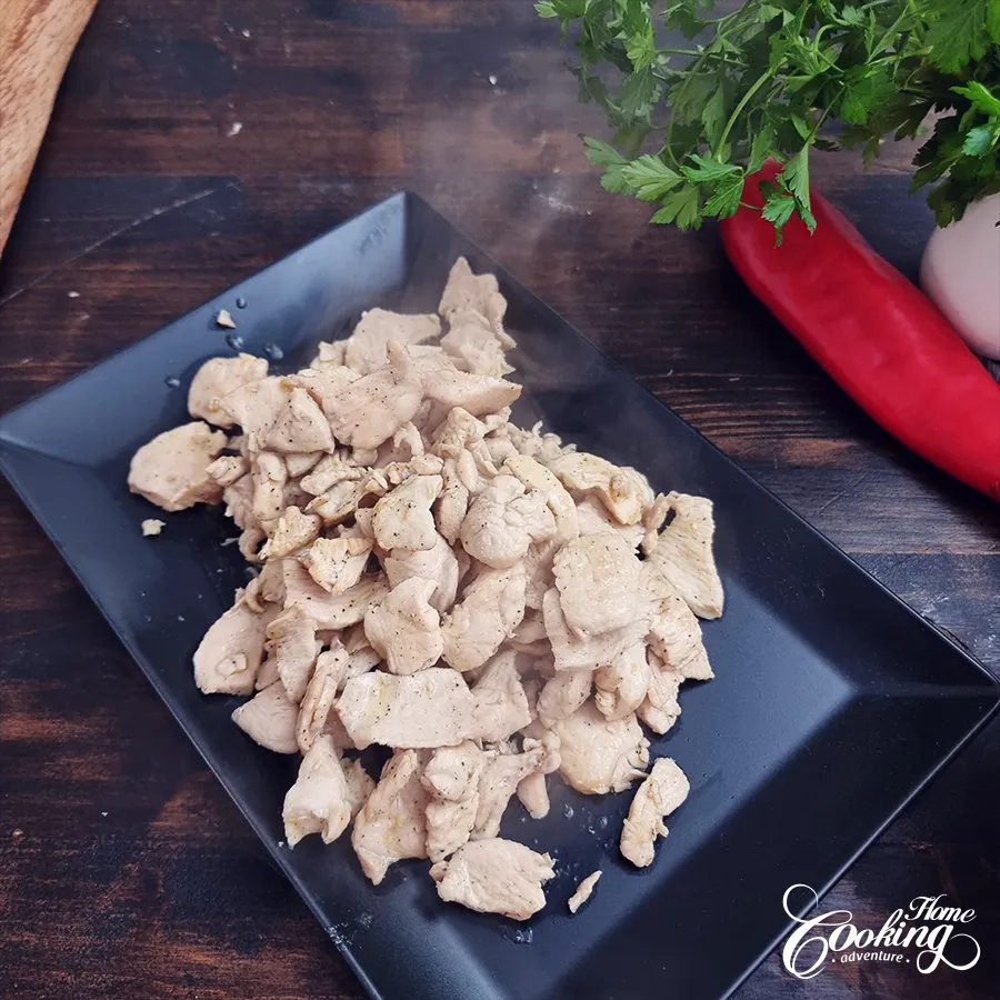 Cut the chicken into thin slices.