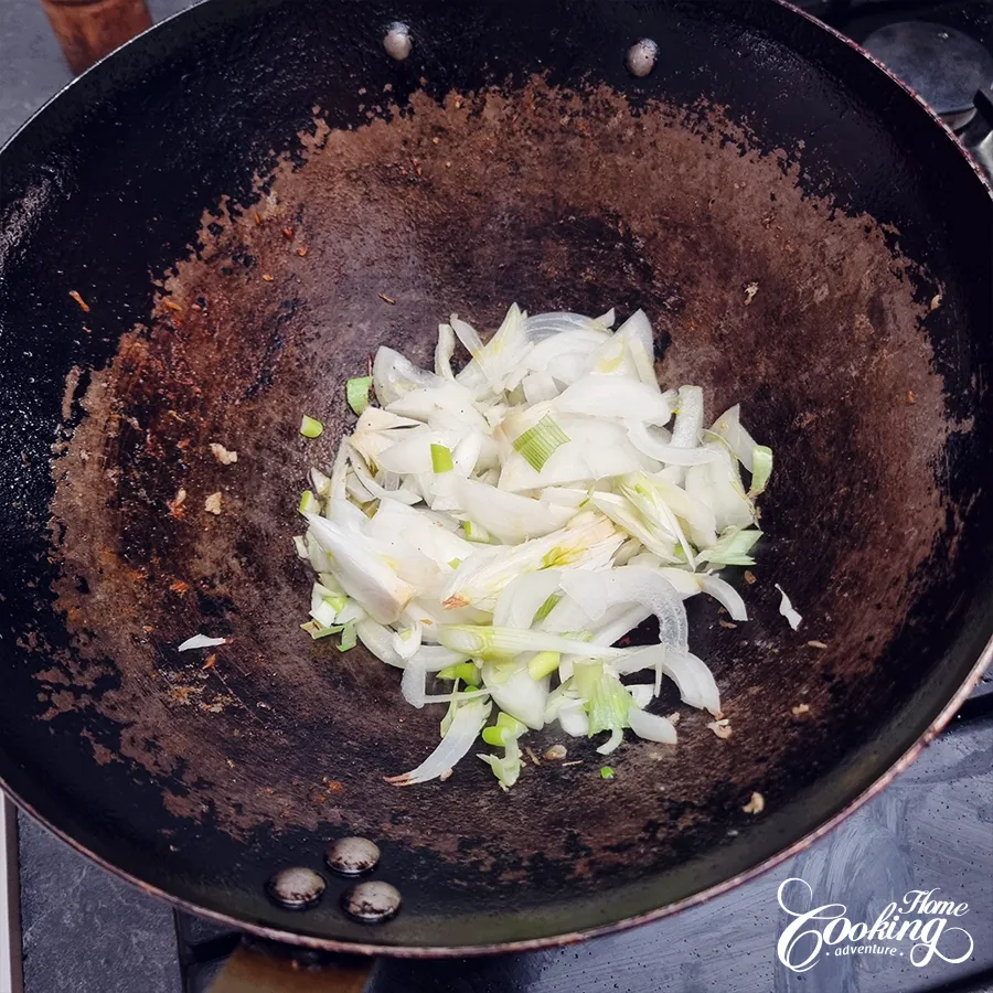 Add remaining oil to the wok. Sauté the onion for 2–3 minutes until translucent.