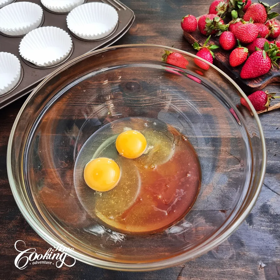 Add eggs with honey and vanilla extract into a large bowl and mix to combine.