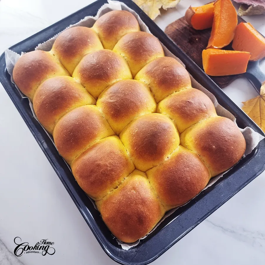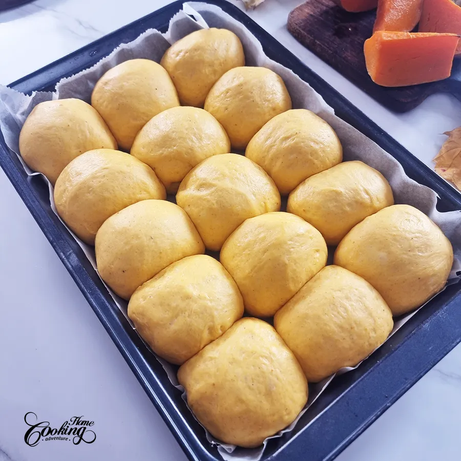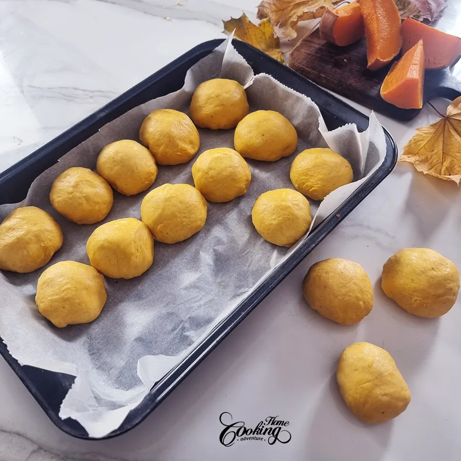 Form into rolls and place on a parchment paper lined (9×13 inch – 23x33cm) pan with distance between them to allow them to rise.