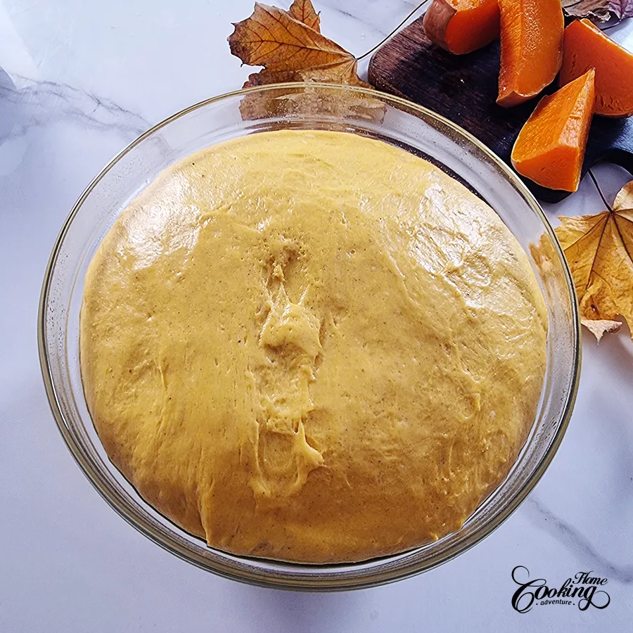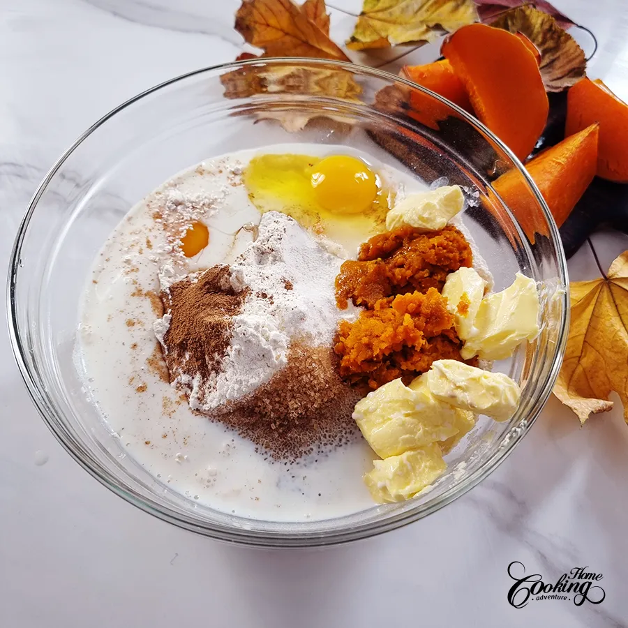 Add the rest of ingredients, flour, sugar, salt, cinnamon, remaining milk, eggs, pumpkin puree and softened butter.