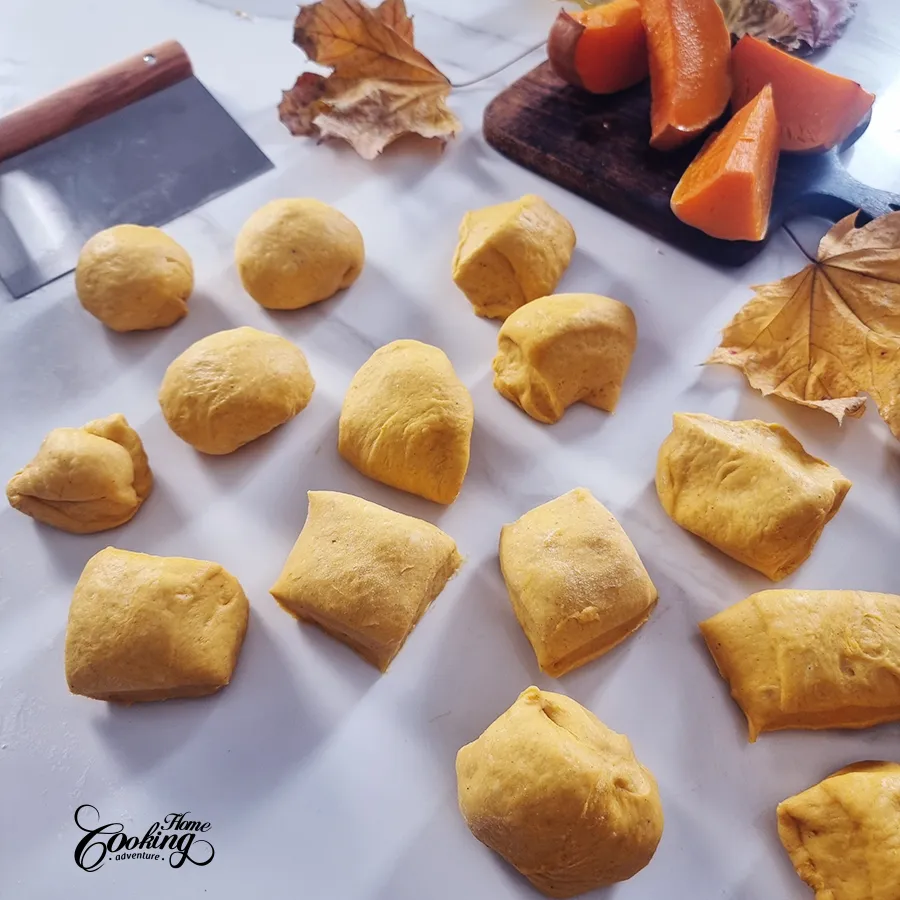 Sprinkle flour on the working surface, place the dough and cut in 15 pieces.