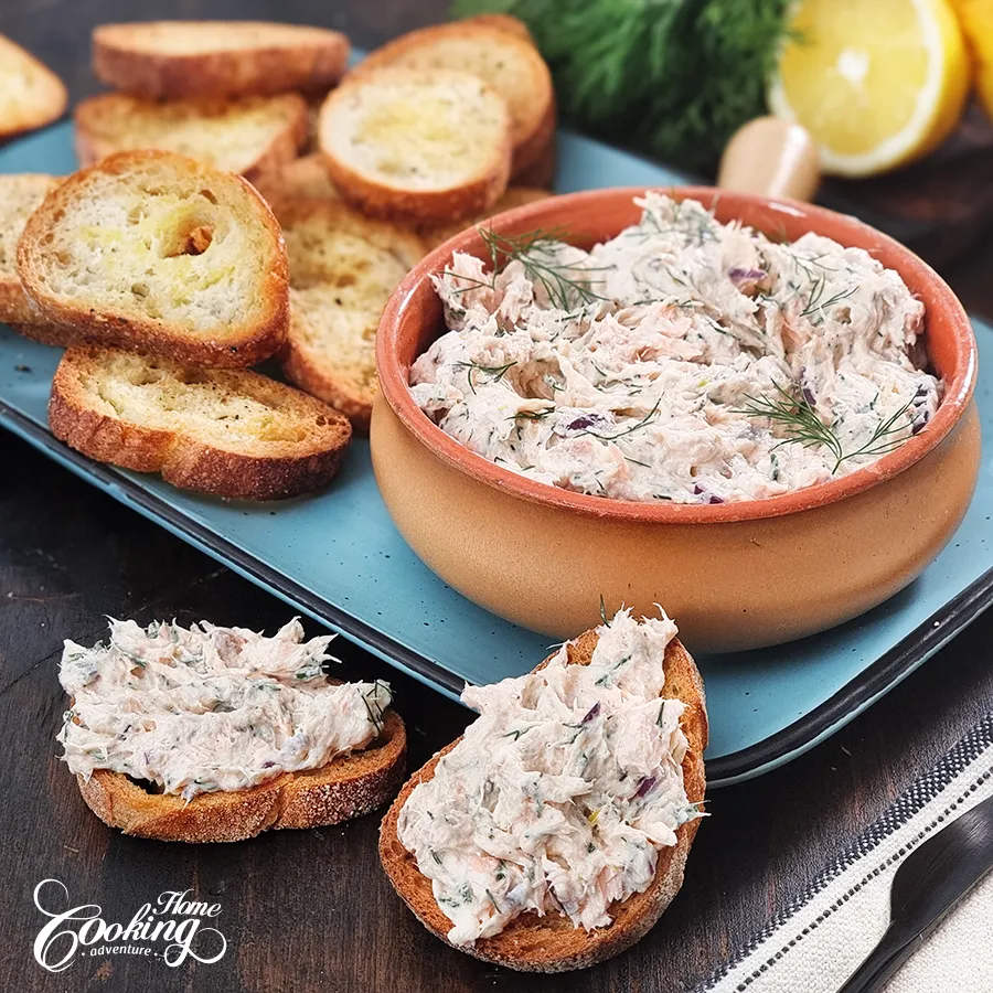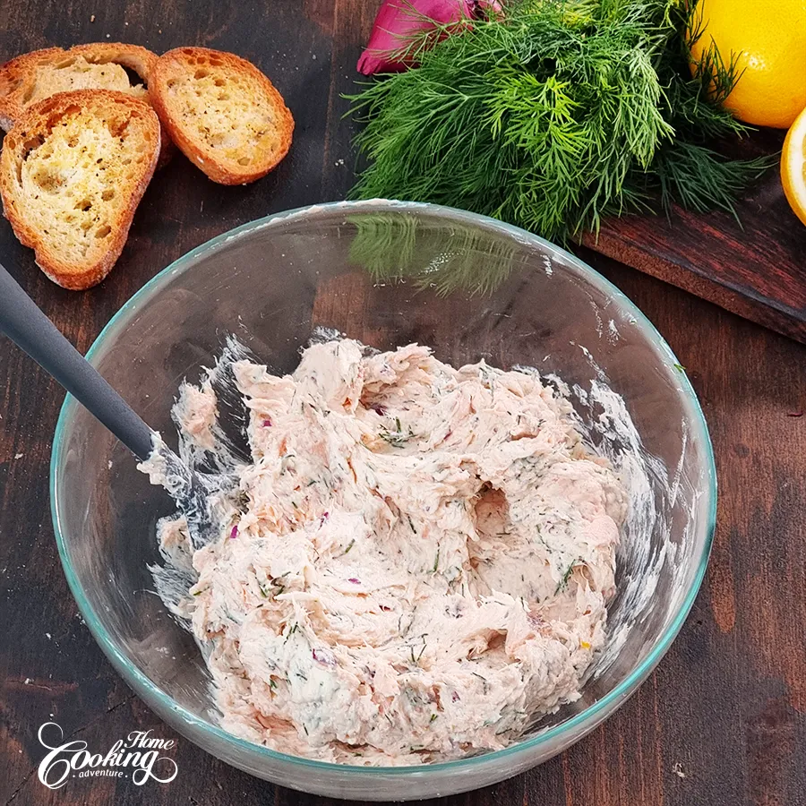 Before serving, garnish with fresh dill if desired. Serve the salmon dip with crackers, vegetable sticks or toasted bread.
